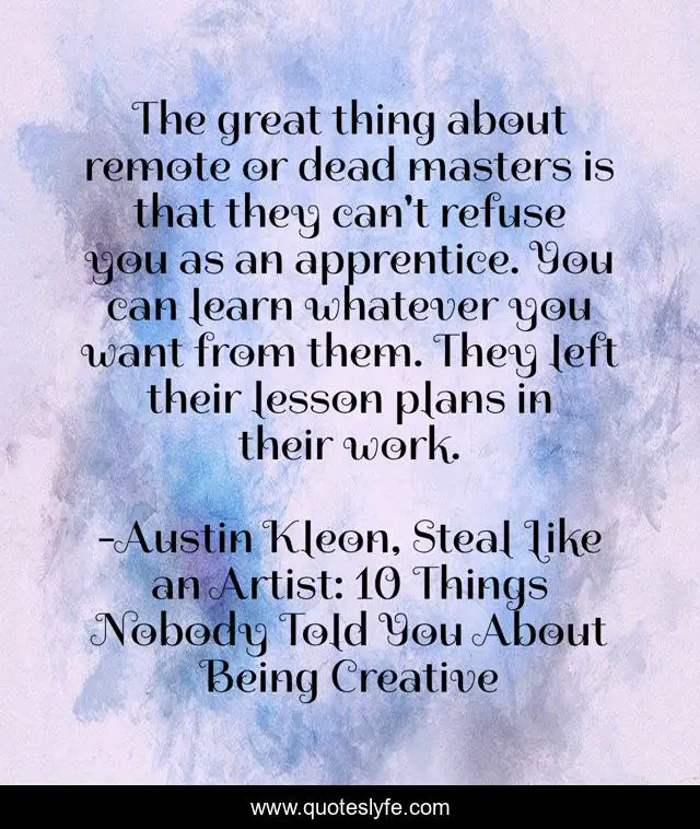 This page presents the quote "The great thing about remote or dead masters is that they can't refuse you as an apprentice. You can learn whatever you want from them. They left their lesson plans in their work.". Author of this quote is Austin Kleon, Steal Like an Artist: 10 Things Nobody Told You About Being Creative. This quote is about masters, apprentice, learning, learn,.