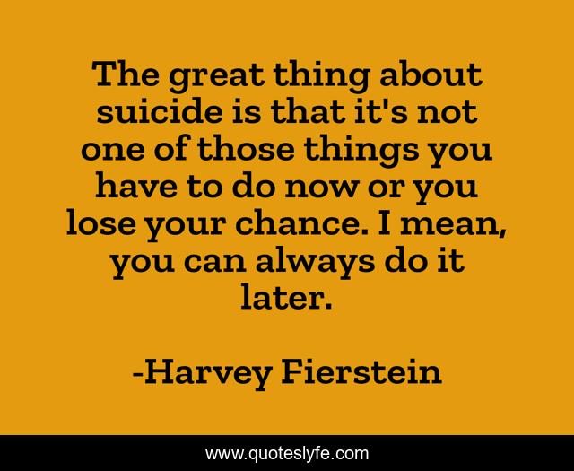 This page presents the quote "The great thing about suicide is that it's not one of those things you have to do now or you lose your chance. I mean, you can always do it later.". Author of this quote is Harvey Fierstein. This quote is about great, suicide,.