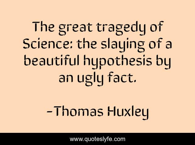 This page presents the quote "The great tragedy of Science: the slaying of a beautiful hypothesis by an ugly fact.". Author of this quote is Thomas Huxley. This quote is about science, technology,.