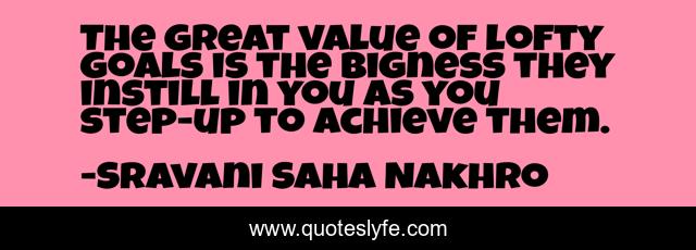 This page presents the quote "The great value of lofty goals is the bigness they instill in you as you step-up to achieve them.". Author of this quote is Sravani Saha Nakhro. .