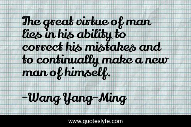 This page presents the quote "The great virtue of man lies in his ability to correct his mistakes and to continually make a new man of himself.". Author of this quote is Wang Yang-Ming. This quote is about failures, mistakes,.