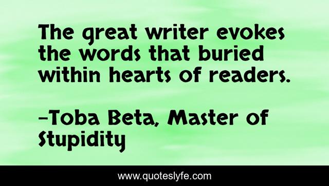 This page presents the quote "The great writer evokes the words that buried within hearts of readers.". Author of this quote is Toba Beta, Master of Stupidity. This quote is about heart, evokes, buried, words, reader, great-writer,.
