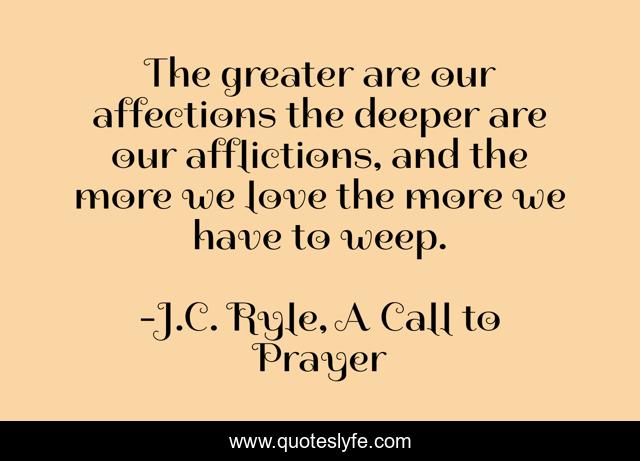 This page presents the quote "The greater are our affections the deeper are our afflictions, and the more we love the more we have to weep.". Author of this quote is J.C. Ryle, A Call to Prayer. This quote is about love, sorrow, sadness, weeping, prayer, affection,.