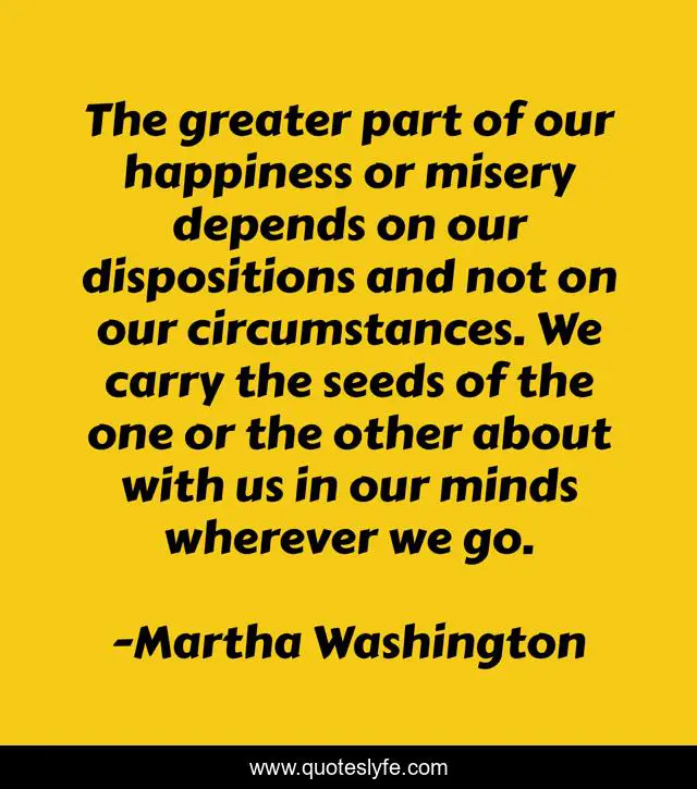 This page presents the quote "The greater part of our happiness or misery depends on our dispositions and not on our circumstances. We carry the seeds of the one or the other about with us in our minds wherever we go.". Author of this quote is Martha Washington. This quote is about carry, seeds, circumstances,.