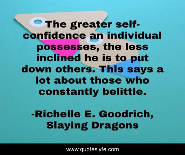 This page presents the quote "The greater self-confidence an individual possesses, the less inclined he is to put down others. This says a lot about those who constantly belittle.". Author of this quote is Richelle E. Goodrich, Slaying Dragons. This quote is about criticism, self-confidence, belittling, richelle-e-goodrich, put-downs, self-worth, self-image, richelle, richelle-goodrich,.