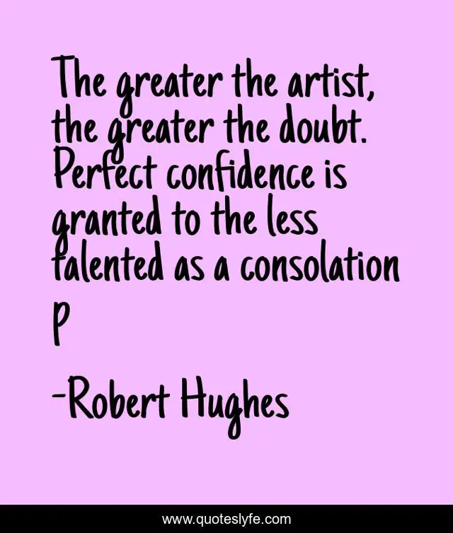 This page presents the quote "The greater the artist, the greater the doubt. Perfect confidence is granted to the less talented as a consolation p". Author of this quote is Robert Hughes. This quote is about art, paul-cezanne, artists, fame, depression, self-esteem-or-lack-thereof, confidence, great-art, insecurity,.