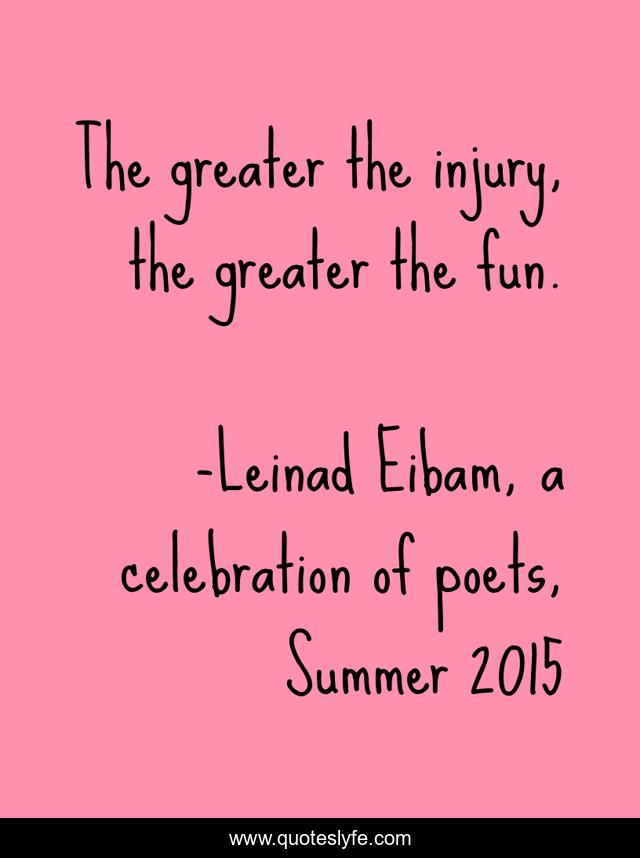 This page presents the quote "The greater the injury, the greater the fun.". Author of this quote is Leinad Eibam, a celebration of poets, Summer 2015. This quote is about cute, ollyvia, humor, funny, maybe, hilarious, deep, paint, daniel,.