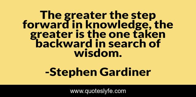 This page presents the quote "The greater the step forward in knowledge, the greater is the one taken backward in search of wisdom.". Author of this quote is Stephen Gardiner. This quote is about step, search, wisdom,.