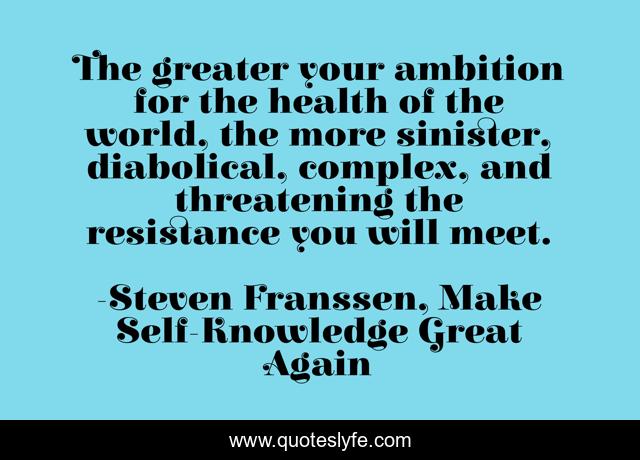 This page presents the quote "The greater your ambition for the health of the world, the more sinister, diabolical, complex, and threatening the resistance you will meet.". Author of this quote is Steven Franssen, Make Self-Knowledge Great Again. This quote is about pizzagate, culture-war, evil, opposition,.