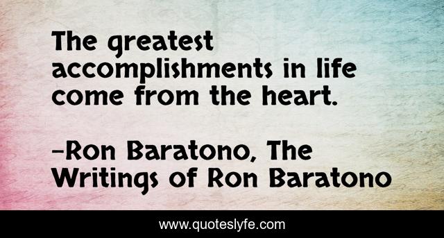 This page presents the quote "The greatest accomplishments in life come from the heart.". Author of this quote is Ron Baratono, The Writings of Ron Baratono. This quote is about heart, life, accomplishments,.
