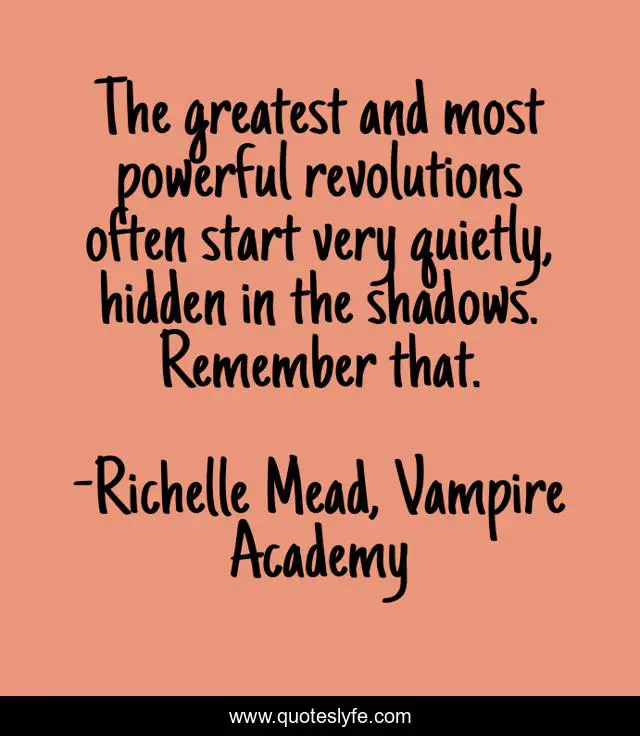 This page presents the quote "The greatest and most powerful revolutions often start very quietly, hidden in the shadows. Remember that.". Author of this quote is Richelle Mead, Vampire Academy. This quote is about politics, revolution,.