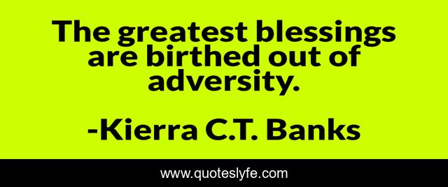 This page presents the quote "The greatest blessings are birthed out of adversity.". Author of this quote is Kierra C.T. Banks. This quote is about life, love, journey, passion, qoutes, inspirational, enthusiasm, affection,.