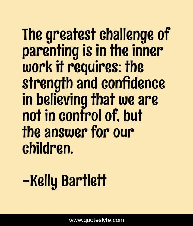 This page presents the quote "The greatest challenge of parenting is in the inner work it requires: the strength and confidence in believing that we are not in control of, but the answer for our children.". Author of this quote is Kelly Bartlett. This quote is about parenting, connection, relationships-with-kids, attachment,.