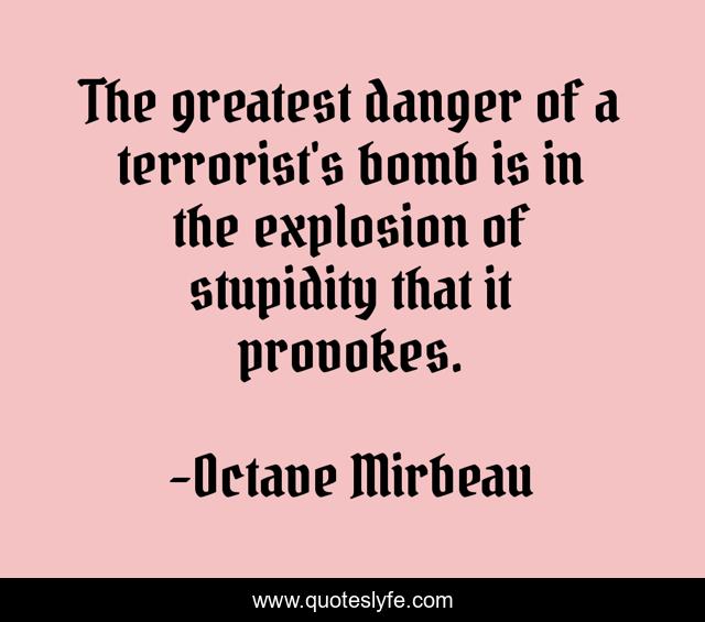 This page presents the quote "The greatest danger of a terrorist's bomb is in the explosion of stupidity that it provokes.". Author of this quote is Octave Mirbeau. This quote is about terrorism, great-war-on-terrorism,.