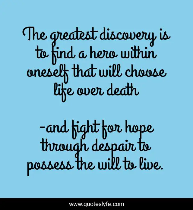 This page presents the quote "The greatest discovery is to find a hero within oneself that will choose life over death". Author of this quote is and fight for hope through despair to possess the will to live.. .