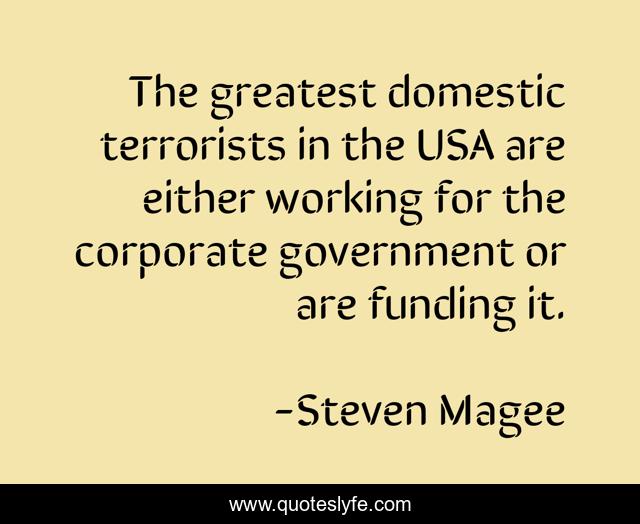 This page presents the quote "The greatest domestic terrorists in the USA are either working for the corporate government or are funding it.". Author of this quote is Steven Magee. This quote is about funding, working, usa, terrorists, government-cover-ups, domestic, government-abuse, either, government-corruption,.