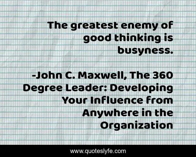 This page presents the quote "The greatest enemy of good thinking is busyness.". Author of this quote is John C. Maxwell, The 360 Degree Leader: Developing Your Influence from Anywhere in the Organization. This quote is about thinking, contemplation, busyness,.