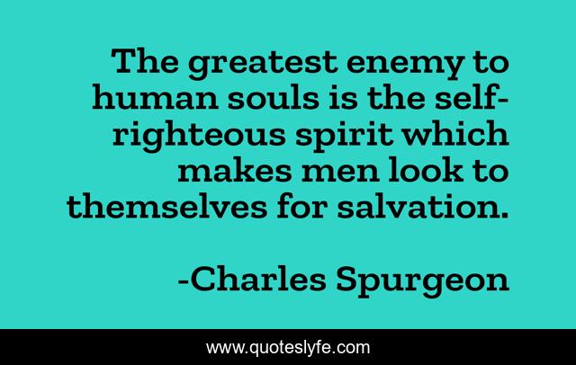This page presents the quote "The greatest enemy to human souls is the self-righteous spirit which makes men look to themselves for salvation.". Author of this quote is Charles Spurgeon. This quote is about greatest, human, look,.