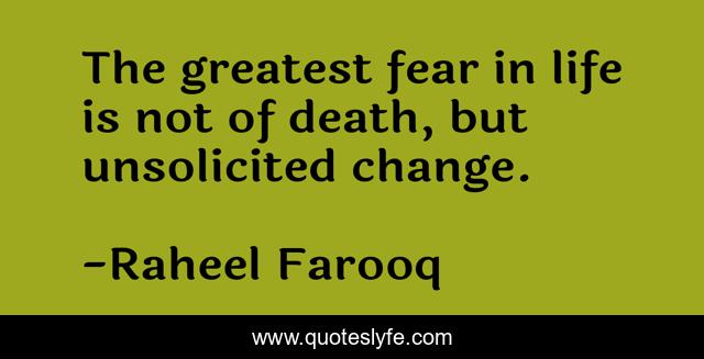 This page presents the quote "The greatest fear in life is not of death, but unsolicited change.". Author of this quote is Raheel Farooq. This quote is about fear, fear-of-death, fear-of-unknown, change, life-and-death,.