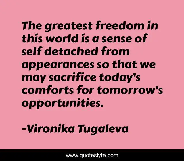 This page presents the quote "The greatest freedom in this world is a sense of self detached from appearances so that we may sacrifice today’s comforts for tomorrow’s opportunities.". Author of this quote is Vironika Tugaleva. This quote is about self-awareness, freedom, sense-of-self, impermanence, embracing-impermanence, change,.