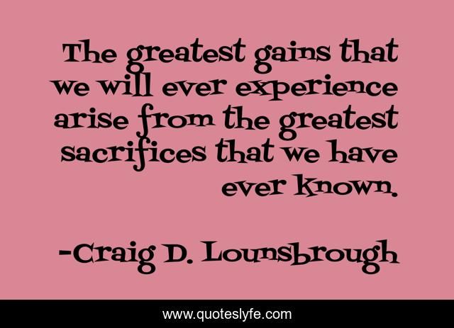 This page presents the quote "The greatest gains that we will ever experience arise from the greatest sacrifices that we have ever known.". Author of this quote is Craig D. Lounsbrough. This quote is about achievements, caring, gains, giving, sacrifice, experience, sacrifices, successes, accomplishments,.