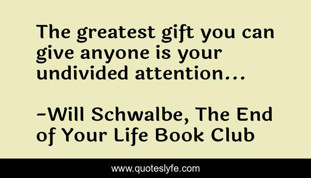This page presents the quote "The greatest gift you can give anyone is your undivided attention...". Author of this quote is Will Schwalbe, The End of Your Life Book Club. .