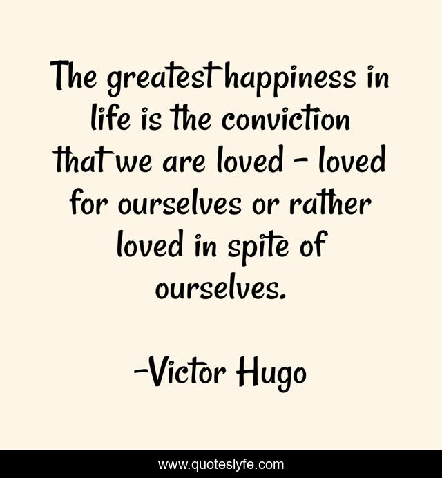 This page presents the quote "The greatest happiness in life is the conviction that we are loved - loved for ourselves or rather loved in spite of ourselves.". Author of this quote is Victor Hugo. This quote is about true, love, affection,.
