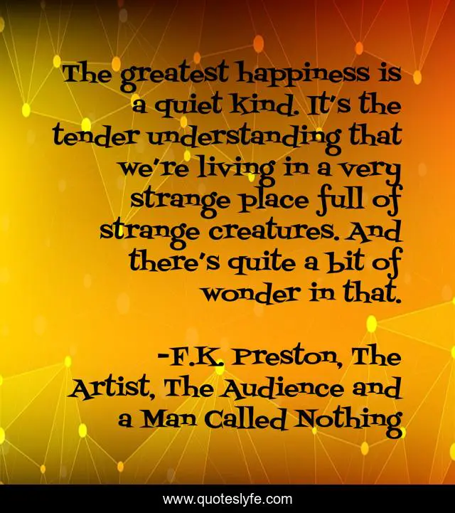 This page presents the quote "The greatest happiness is a quiet kind. It’s the tender understanding that we’re living in a very strange place full of strange creatures. And there’s quite a bit of wonder in that.". Author of this quote is F.K. Preston, The Artist, The Audience and a Man Called Nothing. This quote is about love, family, fantasy, optimistic, writing, philosophy, story, death, humor,.