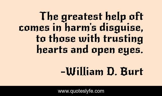 This page presents the quote "The greatest help oft comes in harm's disguise, to those with trusting hearts and open eyes.". Author of this quote is William D. Burt. This quote is about fantasy, young-adult, inspirational, enthusiasm,.
