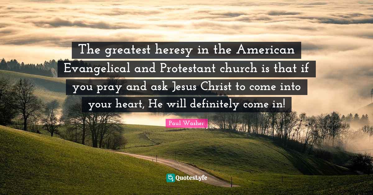 This page presents the quote "The greatest heresy in the American Evangelical and Protestant church is that if you pray and ask Jesus Christ to come into your heart, He will definitely come in!". Author of this quote is Paul Washer. This quote is about church, jesus christ, heresy, jesus, evangelical, heart,.