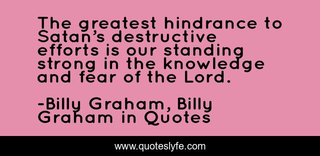 This page presents the quote "The greatest hindrance to Satan’s destructive efforts is our standing strong in the knowledge and fear of the Lord.". Author of this quote is Billy Graham, Billy Graham in Quotes. This quote is about devil, satan, billy-graham,.