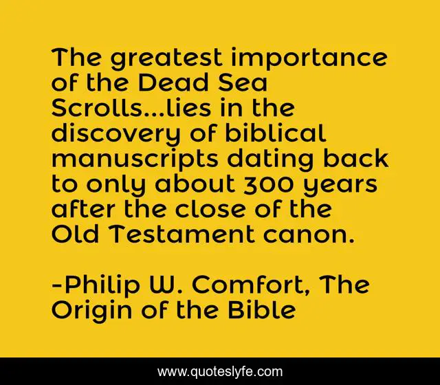 This page presents the quote "The greatest importance of the Dead Sea Scrolls...lies in the discovery of biblical manuscripts dating back to only about 300 years after the close of the Old Testament canon.". Author of this quote is Philip W. Comfort, The Origin of the Bible. This quote is about bible, old-testament, dead-sea-scrolls,.