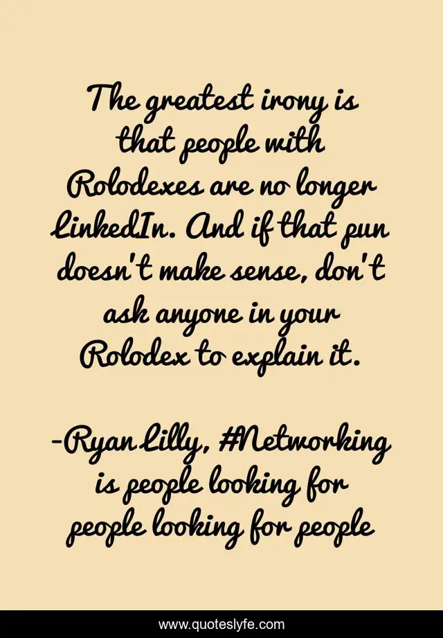 This page presents the quote "The greatest irony is that people with Rolodexes are no longer LinkedIn. And if that pun doesn't make sense, don’t ask anyone in your Rolodex to explain it.". Author of this quote is Ryan Lilly, #Networking is people looking for people looking for people. This quote is about relationships, pun, networking, business, irony, linkedin, connections, rolodex, humor,.