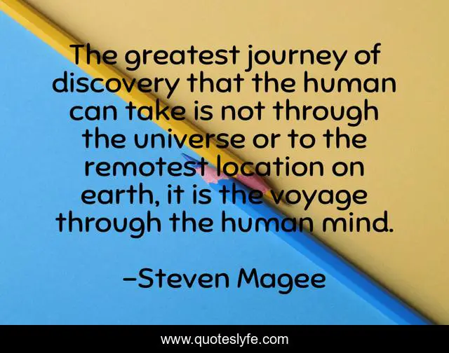 This page presents the quote "The greatest journey of discovery that the human can take is not through the universe or to the remotest location on earth, it is the voyage through the human mind.". Author of this quote is Steven Magee. This quote is about voyage, remotest, universe, greatest, mind, journey, through, take, human,.