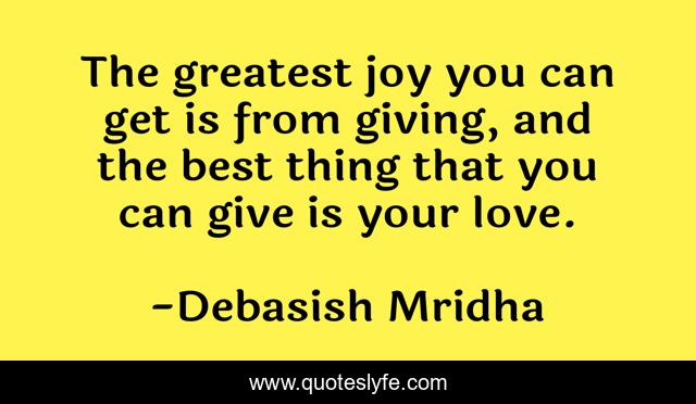 This page presents the quote "The greatest joy you can get is from giving, and the best thing that you can give is your love.". Author of this quote is Debasish Mridha. This quote is about life, love, knowledge, inspirational, intelligence, philosophy, wisdom, quotes, affection,.