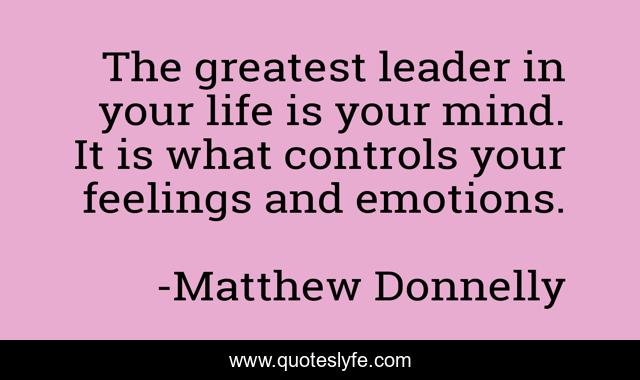 This page presents the quote "The greatest leader in your life is your mind. It is what controls your feelings and emotions.". Author of this quote is Matthew Donnelly. This quote is about personal-development, motivational-inspirational, personal-growth, inspirational, enthusiasm,.