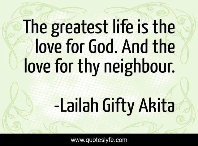 This page presents the quote "The greatest life is the love for God. And the love for thy neighbour.". Author of this quote is Lailah Gifty Akita. This quote is about life, christian, god, motivational, peaceful-coexistence, neighbour, optimistic, positive, love,.
