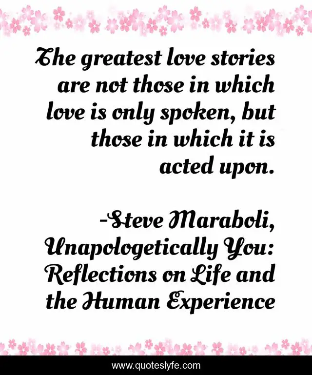 This page presents the quote "The greatest love stories are not those in which love is only spoken, but those in which it is acted upon.". Author of this quote is Steve Maraboli, Unapologetically You: Reflections on Life and the Human Experience. This quote is about relationships, true-love, life, love, success, positive, motivational, soulmates, confidence,.