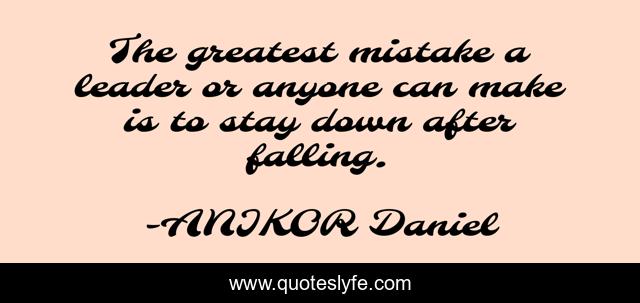 This page presents the quote "The greatest mistake a leader or anyone can make is to stay down after falling.". Author of this quote is ANIKOR Daniel. This quote is about positive, confidence, motivational, optimistic,.
