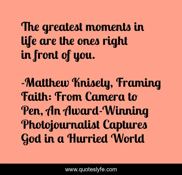 "Matthew Knisely, Framing Faith: From Camera to Pen, An Award-Winning Photojournalist Captures God in a Hurried World Quotes." Quoteslyfe.com, 2025. Sat. 06 Dec. 2025. <https://www.quoteslyfe.com/quote/The-greatest-moments-in-life-are-the-238613>.