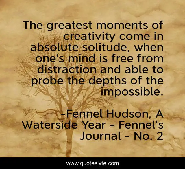 This page presents the quote "The greatest moments of creativity come in absolute solitude, when one’s mind is free from distraction and able to probe the depths of the impossible.". Author of this quote is Fennel Hudson, A Waterside Year - Fennel's Journal - No. 2. This quote is about writers-inspiration, creativity, writing, writers, writers-on-writing, inspiration,.