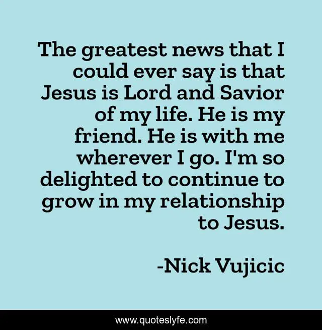 This page presents the quote "The greatest news that I could ever say is that Jesus is Lord and Savior of my life. He is my friend. He is with me wherever I go. I'm so delighted to continue to grow in my relationship to Jesus.". Author of this quote is Nick Vujicic. This quote is about me, life, greatest,.