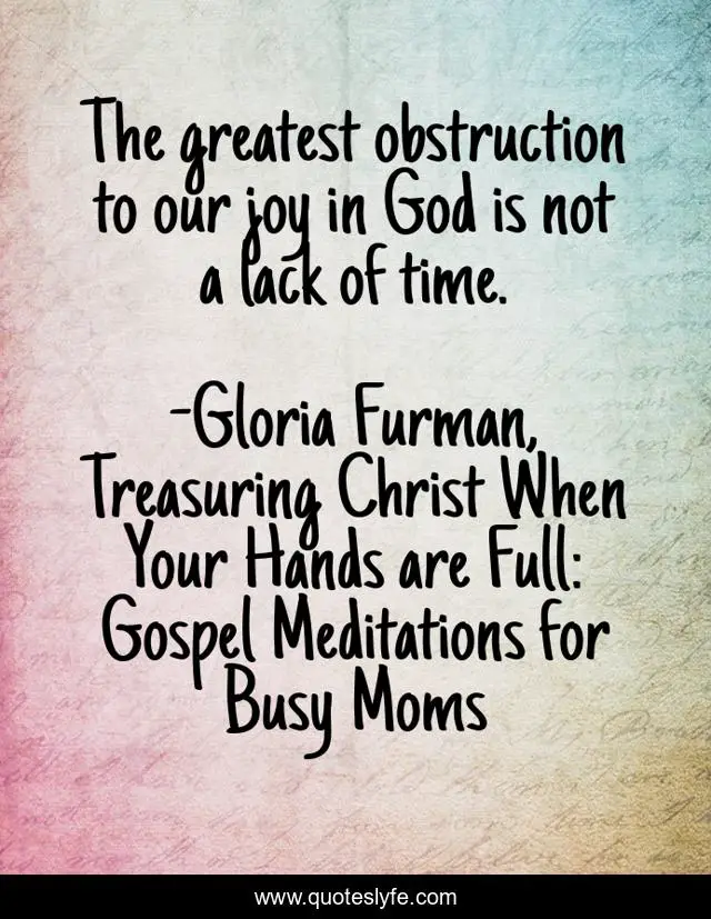 This page presents the quote "The greatest obstruction to our joy in God is not a lack of time.". Author of this quote is Gloria Furman, Treasuring Christ When Your Hands are Full: Gospel Meditations for Busy Moms. This quote is about joy, pg57,.
