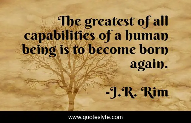 This page presents the quote "The greatest of all capabilities of a human being is to become born again.". Author of this quote is J.R. Rim. This quote is about be, gift-from-god, capable, being, freedom, free-will, able, possible, from-above,.