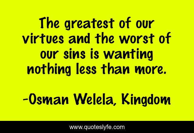 This page presents the quote "The greatest of our virtues and the worst of our sins is wanting nothing less than more.". Author of this quote is Osman Welela, Kingdom. This quote is about greed, power, wisdom,.
