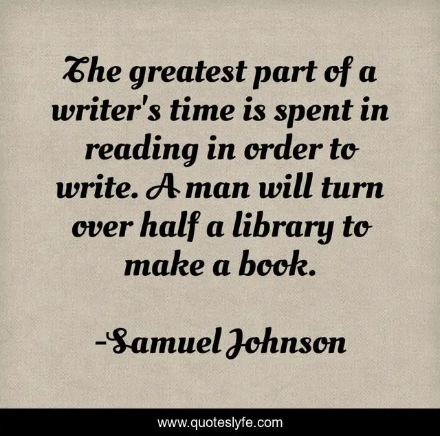 This page presents the quote "The greatest part of a writer's time is spent in reading in order to write. A man will turn over half a library to make a book.". Author of this quote is Samuel Johnson. This quote is about reading, library, man,.