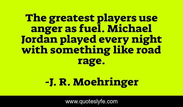 This page presents the quote "The greatest players use anger as fuel. Michael Jordan played every night with something like road rage.". Author of this quote is J. R. Moehringer. This quote is about greatest, road, night,.