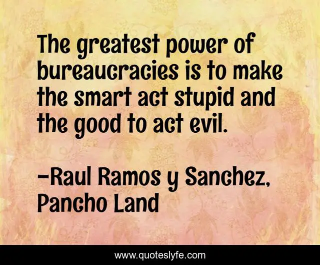 This page presents the quote "The greatest power of bureaucracies is to make the smart act stupid and the good to act evil.". Author of this quote is Raul Ramos y Sanchez, Pancho Land. This quote is about bureaucracy, good-and-evil,.