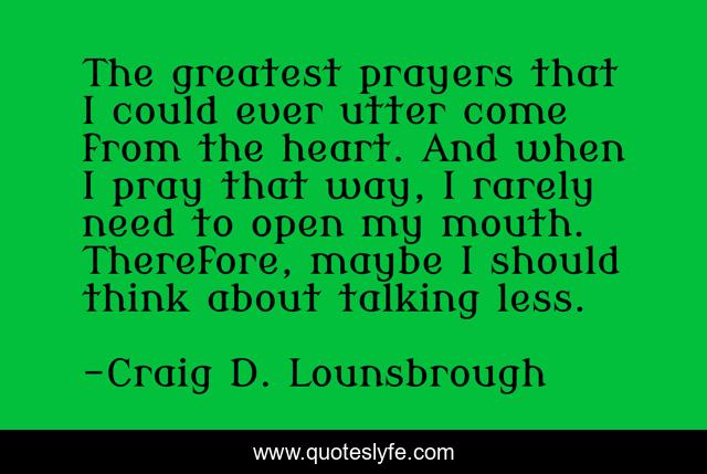 This page presents the quote "The greatest prayers that I could ever utter come from the heart. And when I pray that way, I rarely need to open my mouth. Therefore, maybe I should think about talking less.". Author of this quote is Craig D. Lounsbrough. This quote is about jesus-christ, faith, savor, christian, reflection, heart, pray, god, soul,.