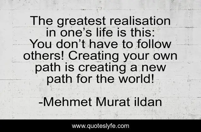 This page presents the quote "The greatest realisation in one’s life is this: You don’t have to follow others! Creating your own path is creating a new path for the world!". Author of this quote is Mehmet Murat ildan. This quote is about realisation, life, follow, world, path, following-others, new-path,.